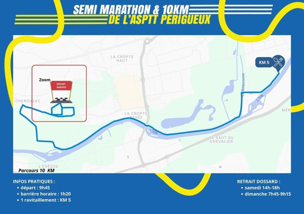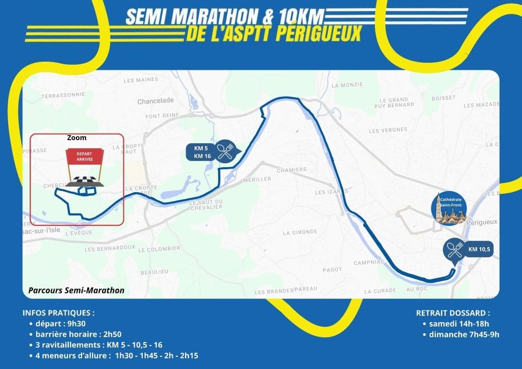 Sur un parcours roulant, principalement sur voie verte, les participants s’élanceront jusqu’au centre-ville de Périgueux (pour le semi marathon) avant de faire demi-tour vers la ligne d’arrivée.