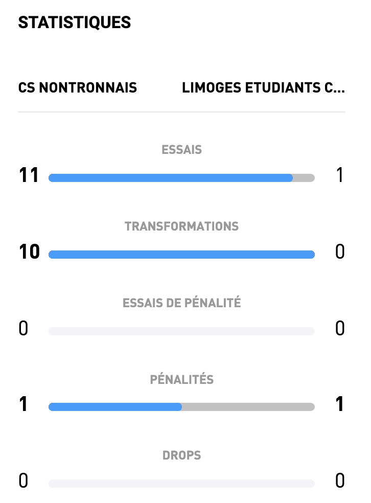 Le match démarre sur les chapeaux de roues, avec un essai dès la première minute signé L. Benoît, transformé par V. Leprêtre. Ce coup d’éclat donne le ton d’une rencontre à sens unique. Les rouges et blancs ont littéralement déroulé, inscrivant pas moins de 11 essais face à des Limougeauds dépassés dans tous les secteurs de jeu.